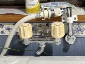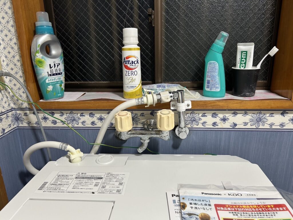 洗濯機を設置したところなんと水栓か当たってしまいホースが接続できません。そこで店長、急遽水側の給水管を取り外し壁ピタ水栓を取り付け、ホースを接続する事に成功しました。これに要する時間、およそ2時間。店長の準備周到の賜物でした。ちなみに壁ピタ水栓が左に傾いているのは、壁内の水道管が古く、これ以上回すと破損する恐れかあったためご了解の上この様にしたそうです。何はともあれ、良かったです。ありがとうございました。