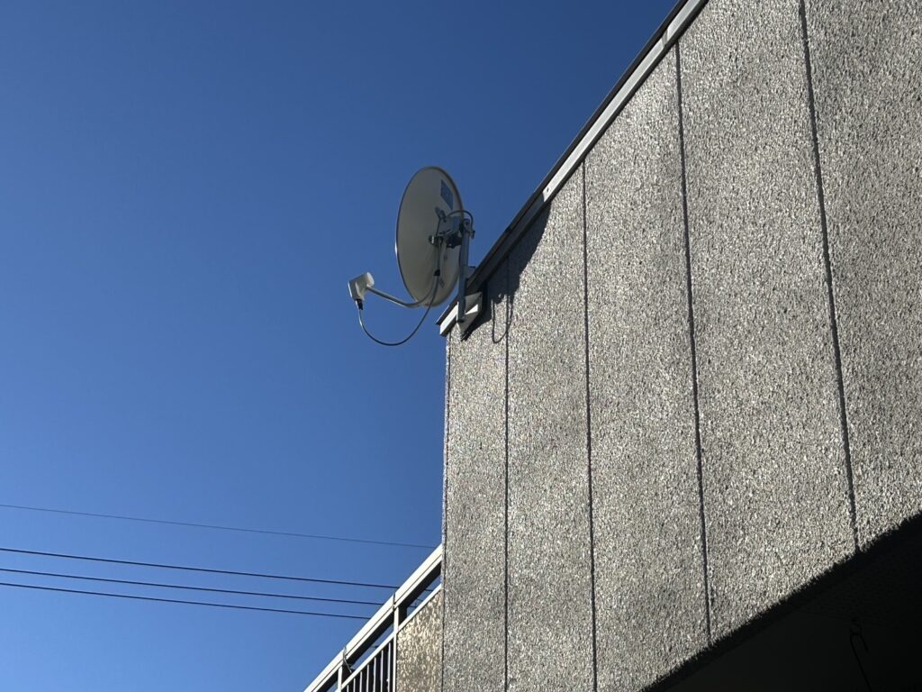 「BS放送を見たい」とのご依頼でBSアンテナ工事をさせて頂きました。アンテナは、ベランダに取り付けて配線を建物の反対側まで行い、全ての部屋で視聴出来る様にしました。ありがとうございました。